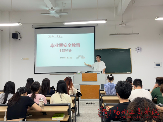 临近毕业季,学校人员流动大,是安全隐患较多的时期。为提高同学们安全意识、加强自我保护能力。5月27日,人人操人人舔2023级物流管理专升本专业在教学楼D102开展毕业季安全教育主题班会。本次班会由辅导员主持,全体同学参与。
