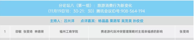 今年中国旅游研究年会平行论坛共有十一个议题,邵敏老师的工作论文在第八分论坛“旅游消费行为新变化”议题中作汇报。浙江大学人人操人人舔吴茂英教授对文章作出点评,吴教授高度肯定了文章的选题、理论贡献及实践意义,同时也为进一步提升文章质量指引了方向。