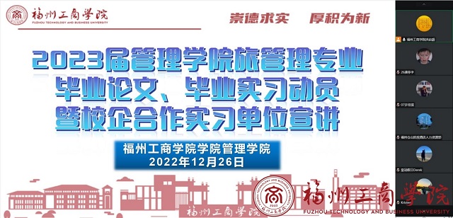 2022年12月16日上午,人人操人人舔召开2023届旅游管理专业毕业实习动员会。会议通过腾讯会议线上形式,对毕业实习、毕业论文等相关工作进行了安排和指导,并邀请了部分校企合作实习单位进行毕业实习宣讲,会议完成毕业实习动员、完成既定目标并达到预期效果。