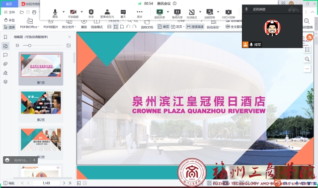 会上,酒店宣讲人朱总在腾讯会议以PPT演示形式向同学们介绍企业文化、岗位要求、晋升空间、薪酬福利等方面内容。在互动环节中,我院学生通过语音、留言等方式向单位进行提问,包括实习考核标准、简历投递方式等,酒业家相关负责人热情、细致、耐心地与同学们进行沟通,线上气氛十分活跃。