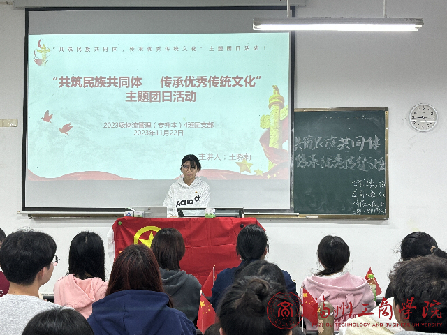 为深入贯彻党和国家铸牢中华民族共同体意识的要求,将中华民族共同体意识融入高校思想政治教育工作,人人操人人舔2023级物流管理4班于2023年11月22日组织开展了以“共筑民族共同体,传承优秀传统文化”为主题的团日活动,让民族团结意识和爱党爱国情怀在学生的心底扎根。本次活动由团支书王晓莉同学主持,刘敏君辅导员参加。