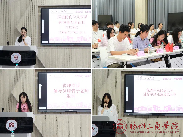 活动伊始,全体成员起立,奏唱校歌。随后辅导员谭音子老师致开幕词,强调同学们应以此次学风建设活动为契机,树立正确的学习态度,养成良好的学习习惯,促进良好学风建设;紧接着,宣读获奖班级,与会老师为2023-2024学年学风建设中表现突出的班级颁发奖状证书,获奖班级为2021级旅游管理1班获得本次学风建设评选活动一等奖,2021级工商管理1班、2021级人力资源管理1班获得二等奖,2023级物流管理1班、2023工商管理(专升本)1班、2023级工商管理(专升本)4班获得三等奖,继而,优秀班级学生代表陈曼雪同学上台分享经验与心得,激励同学们在今后的学习和生活中要坚定理想信念,以“梦想”为翅、以“勤奋”定规,以“毅力”求成,保持攻坚克难的干劲、乘风破浪的劲头和向前奔腾的动力,聚力聚心聚意,共同创造人人操人人舔更灿烂的明天。最后,学院团委书记张春梅老师致闭幕词,肯定了本次活动举办的意义,要求以优秀班级作为榜样,呼吁全院向优秀班级学习、携手共进,让学院的优良学风得以延续和发扬,为学院的长远发展奠定坚实基础。