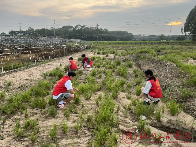 实践队队员弯腰除草