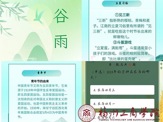 活动采用一个节气和一个专题知识为一期展示内容,总共采用了惊蛰、春分、清明、谷雨、立夏、小满、芒种这六个节气,与雷锋精神、安全月、文明祭扫、学习月、青年节、心理健康、世界环卫等专题新知相配合,通过在H5链接上展示有关节气和新知的内容,帮助同学们了解和学习特定专题的节气文化和新时代新知识。同时,在知识展示结束后设置答题项目,为同学们巩固前面浏览的节气文化和新知提供条件,使同学们在答题的过程中感受和加深对节气文化和新知新识的认识和理解。