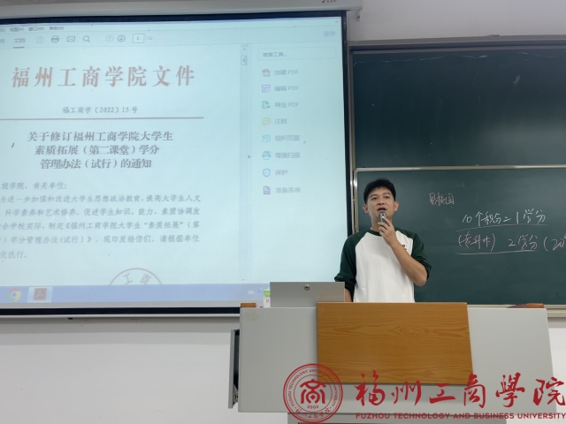 辅导员结合“第二课堂”,深入阐述了其对于大学生素质拓展的核心作用。他进一步解释了“第二课堂”提供的七大活动类别与规则,包括思想成长、实习实践等,并鼓励新生们积极参与,从中累积宝贵经验。同时,分享了学长学姐们在“第二课堂”中的优秀案例。另外深入阐述了劳动教育在培养学生技能和塑造价值观上的重要性。他指出,劳动不仅能增强学生的实践能力,还是他们品质和人生观的锻造与升华。