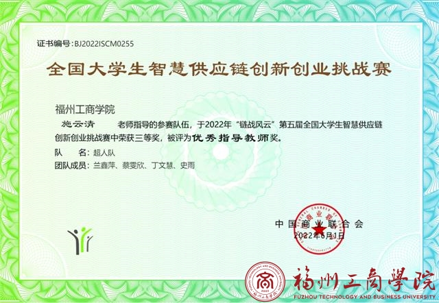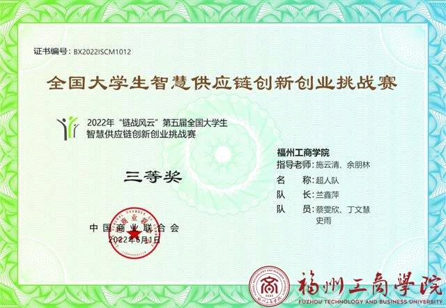 5月26-31日,2022年“链战风云”第五届全国大学生智慧供应链创新创业挑战赛顺利举行。大赛吸引了30个省、自治区、直辖市496所院校874支队伍报名参赛。我校学子经过激烈角逐,最终获得三等奖1项。