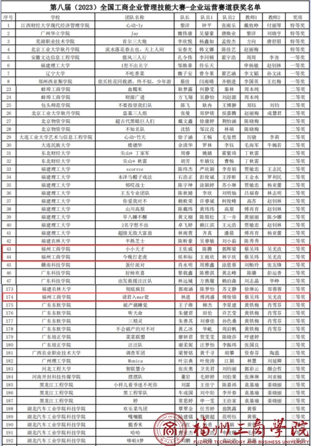 日前,第八届(2023)全国工商企业管理技能大赛—企业运营赛道圆满落幕。本届大赛吸引了来自全国26个省市134所高校的910支队伍参赛,其中由我校工商管理等专业组成的团队:侯和标、王雨欣、林宇欣、王佐威、陈腾、郭辉梁(指导老师:蔡吴玮、吴尤孜)荣获二等奖;林进、傅鸿盛、傅俊锦(指导老师:蔡吴玮、吴尤孜)团队荣获三等奖,全国赛中不乏有辽宁大学、南昌大学、石河子大学、西南政法大学等全国知名211院校,我校代表队充分展现了我校学子扎实的专业功底和良好的综合素质,是学校应用型人才培养成效的呈现。