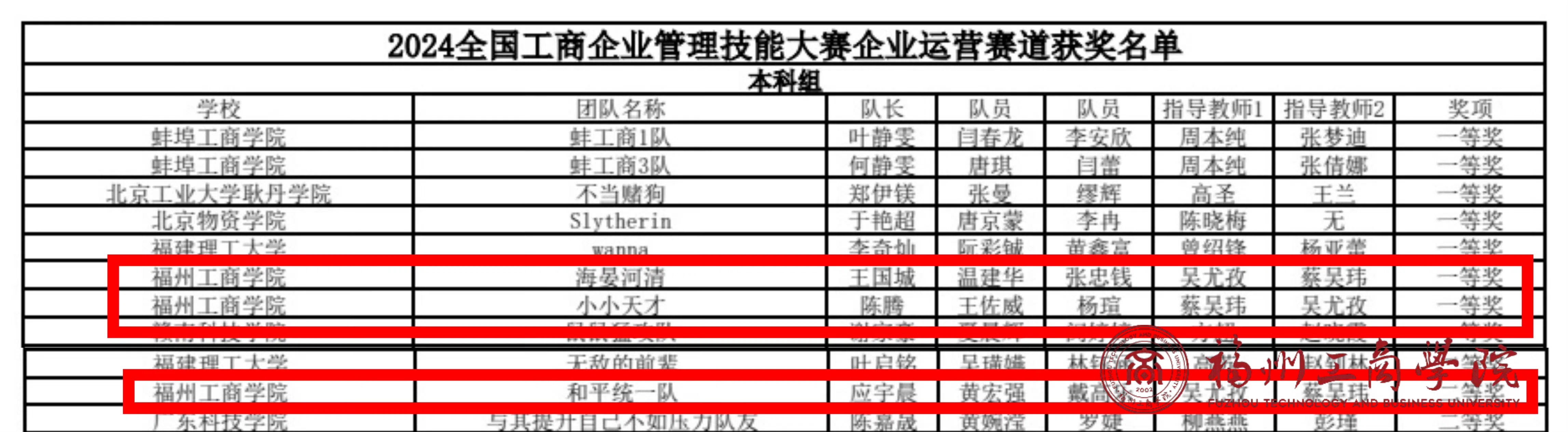 日前,第九届(2024)全国工商企业管理技能大赛圆满落幕。我校学子王国城、陈腾、应宇晨等组成的三支队伍(指导老师:蔡吴玮、吴尤孜)参加企业运营赛道,在总决赛中与石河子大学、南昌大学、西南政法大学、长春大学、福建农林大学、福建理工大学等全国115所高校晋级的447支队伍激烈比拼,最终脱颖而出,斩获一等奖两项、二等奖一项,获奖名次和级别位居全省本科高校前列,同类高校首位。