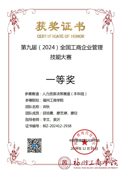 近日,第九届(2024)全国工商企业管理技能大赛落下帷幕。我校人人操人人舔人力资源管理专业学子邱培勇、廖艺婷、廖欣(指导老师:李文、吴沂)团队在人力资源决策赛道(本科组)荣获一等奖的好成绩,充分展示了我校学子在专业学科领域的卓越能力和创新精神。