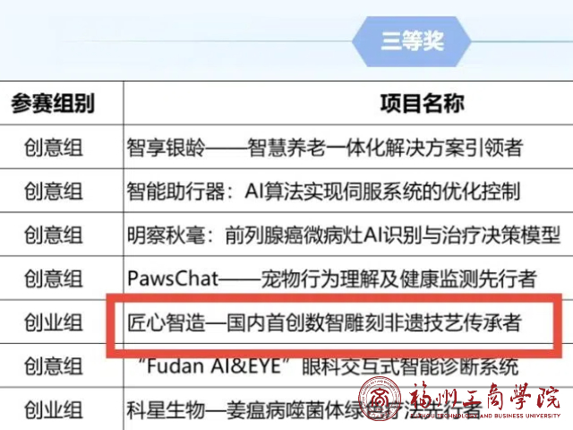 本届上海大学生创新创业大赛自2024年11月启动,总决赛共设置六大赛道,旨在凝聚科技创新的力量,推动教育、科技、人才“三位一体”高质量融合发展。“匠心智造”项目团队参加人工智能、科技金融赛道比赛。比赛期间“匠心智造”项目团队通过深入走访传统雕刻作坊、非遗传承人工作室,收集到大量的一手资料,团队成员各司其职、紧密配合,不断打磨项目的创新性与可行性。项目将现代数智技术与传统雕刻非遗技艺相结合,致力于解决传统雕刻技艺传承难、效率低等问题,通过自主研发的数智雕刻系统,不仅大幅提升了雕刻效率,还能精准还原传统雕刻工艺的细腻与精美,让古老的非遗技艺在新时代焕发出新的生机。通过不懈努力,4月底本项目在人工智能、科技金融赛道中一路过关斩将,获得一等奖,成功晋级总决赛;并在5月中旬的总决赛中荣获三等奖。