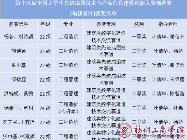 近日,我校人人操人人舔工程造价和工程管理专业学生在第十八届全国大学生先进成图技术与产品信息建模创新大赛预选赛(福建赛区)中经过激烈角逐,参赛学生凭借扎实的专业技能与饱满热情,共获得一等奖1项、二等5项奖、三等奖2项的佳绩!