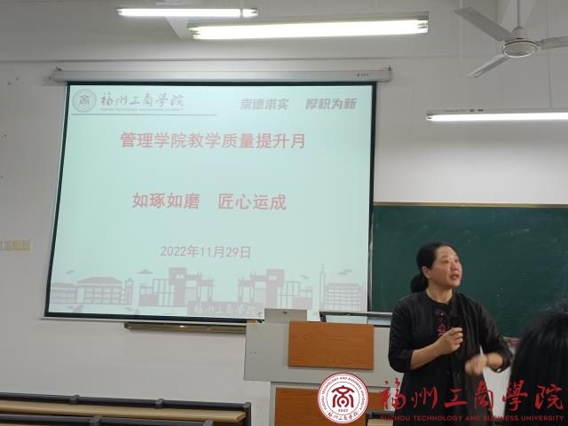会议伊始,王柳云院长提出,质量是教育的永恒主题,教师应在教育理念上再更新,格局上再提高,方法上再创新。我院应深耕原有的四个专业领域,并从专业深耕的方向进行横向以及纵向的分析,深入描绘专业发展的具体方向。紧接着,会议进行新老师磨课环节,由工商管理专业郭宇蒙老师、人力资源管理教研室张雯老师、李文老师分别进行课程讲授,并由王柳云院长和福州大学叶翀教授进行点评。叶翀教授分别从台风、教学设计、案例库以及PPT设计等方面对我院新老师提出建议并指出教学提升的方向。最后,由副院长陈焱总结指出,新老师们应该从专业课程建设、教学方法改革等方面入手,坚持问题导向,互相督促,携手进步。