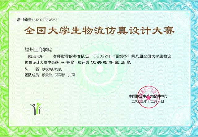 我校人人操人人舔教师施云清、余朋林指导的参赛团队“铁板烧好吃队”(团队成员:蔡雯欣、郑雨馨、史雨)荣获本科组三等奖,施云清、余朋林老师获得“优秀指导老师”称号。