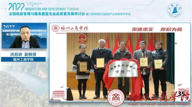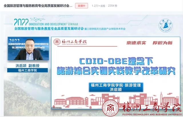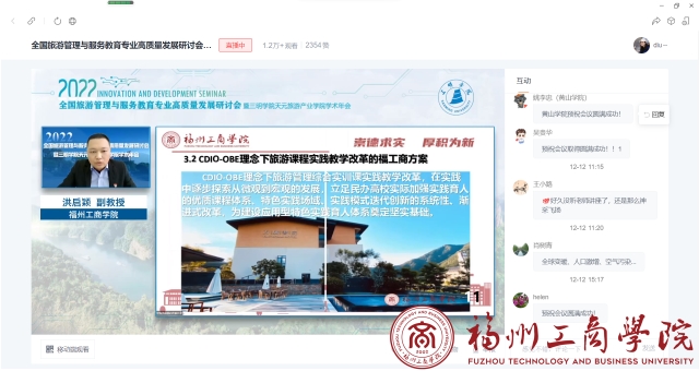12月12日,全国旅游管理与服务教育专业高质量发展研讨会在三明泰宁举办,福州工商学院旅游管理专业兰仙平、洪启颖老师参加会议,洪启颖老师作为嘉宾代表福州工商学院作《CDIO-OBE理念下旅游综合实训实践教学改革研究》的专题报告,得到与会领导专家认可肯定,为福州工商学院知名度提升、旅游管理省级一流专业建设发展形成积极影响。